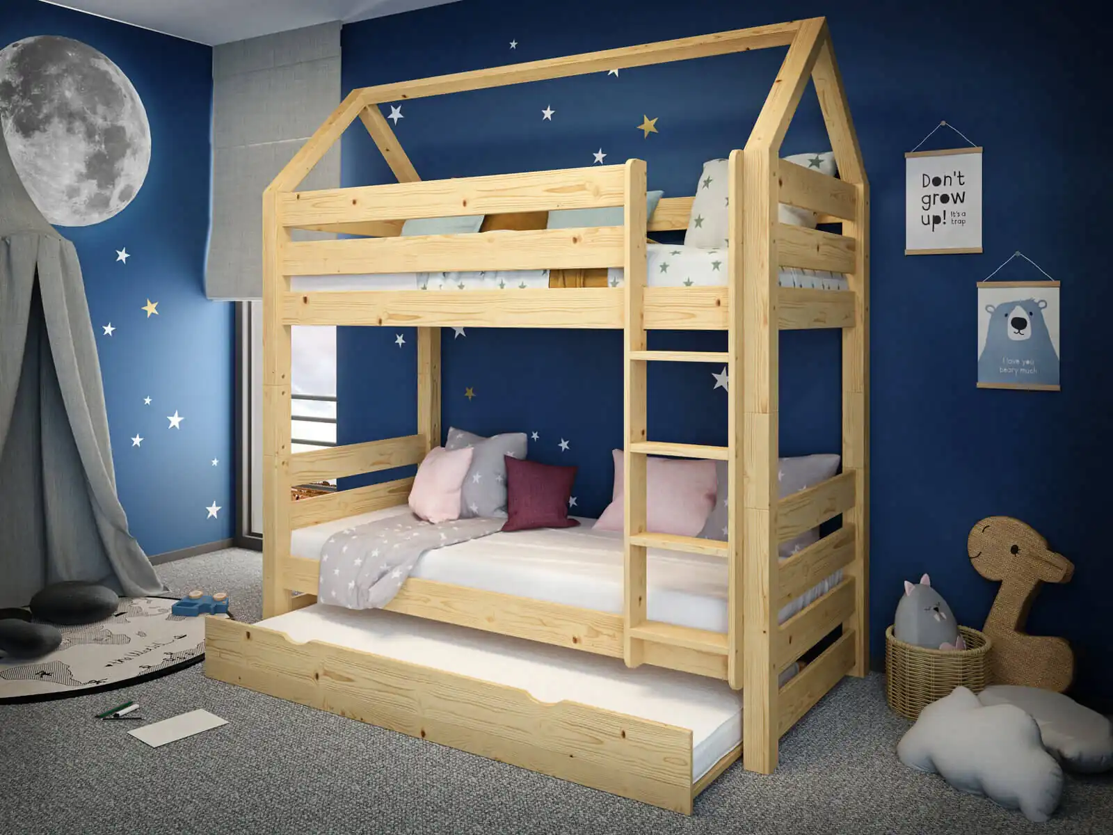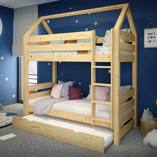 Łóżko piętrowe Jan z daszkiem to więcej niż mebel – to przestrzeń stworzona z myślą o dzieciach, ich rozwoju, potrzebach i codziennych radościach.Stwórz wyjątkowy pokój z łóżkiem, które będzie z dzieckiem przez lata.