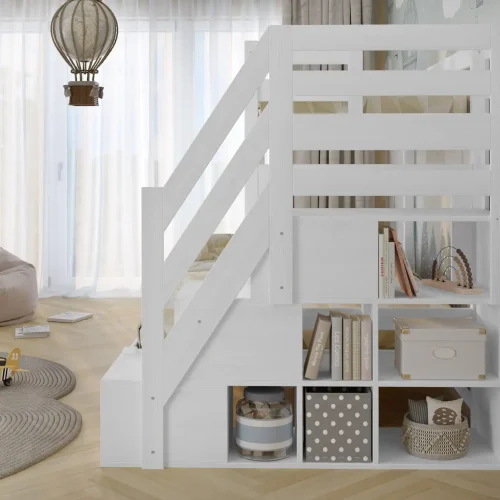 - Ukryte szuflady w schodkach na zabawki, książki i akcesoria.