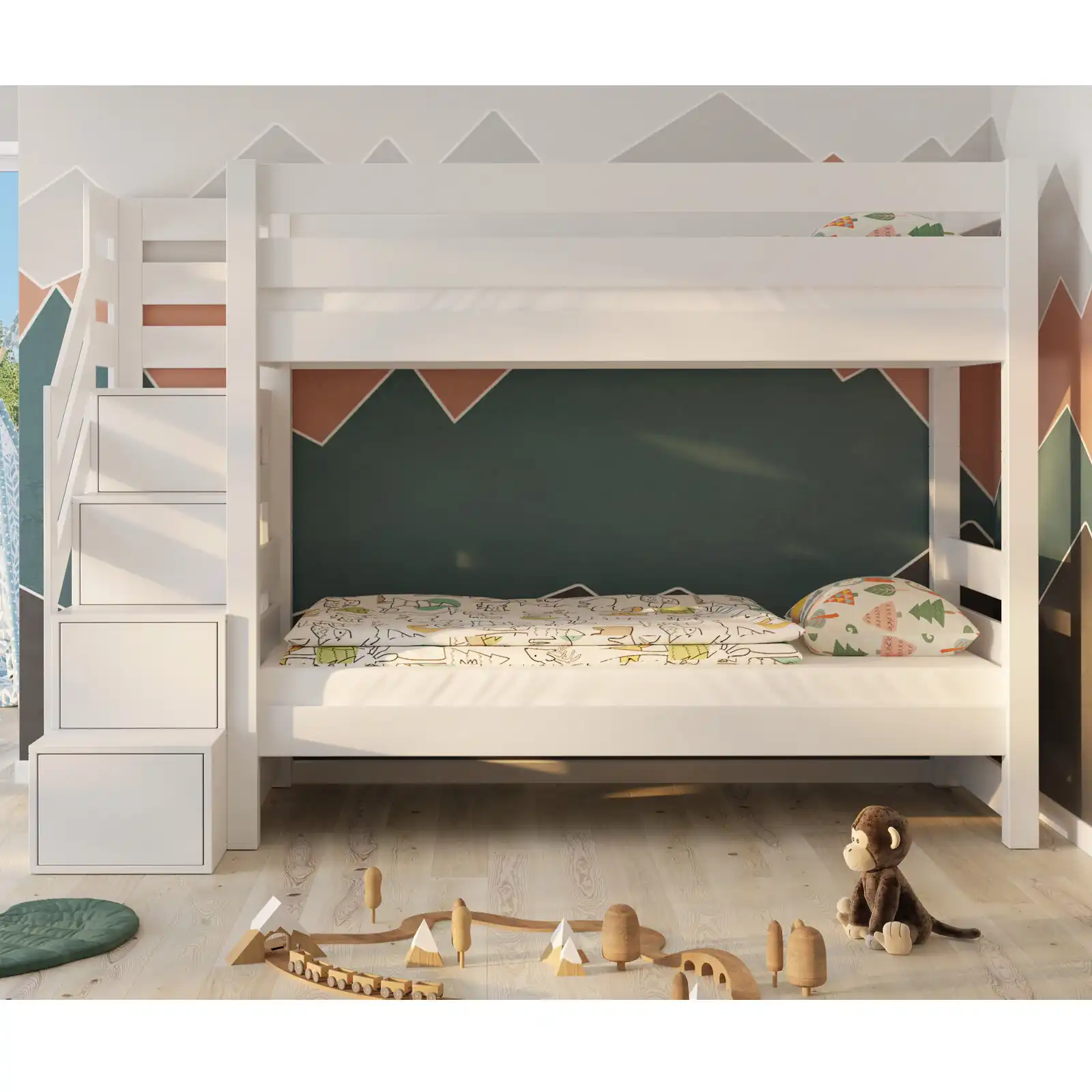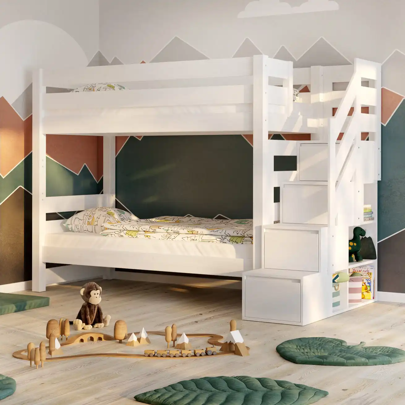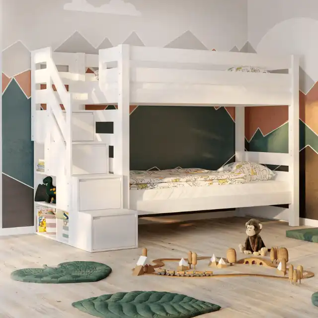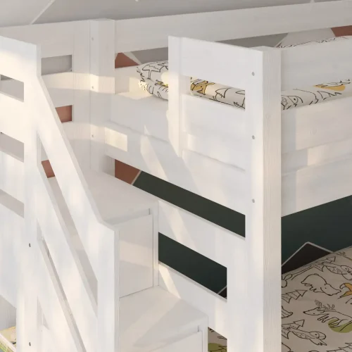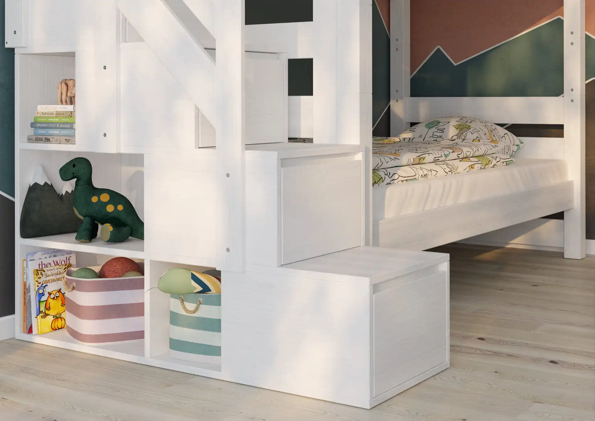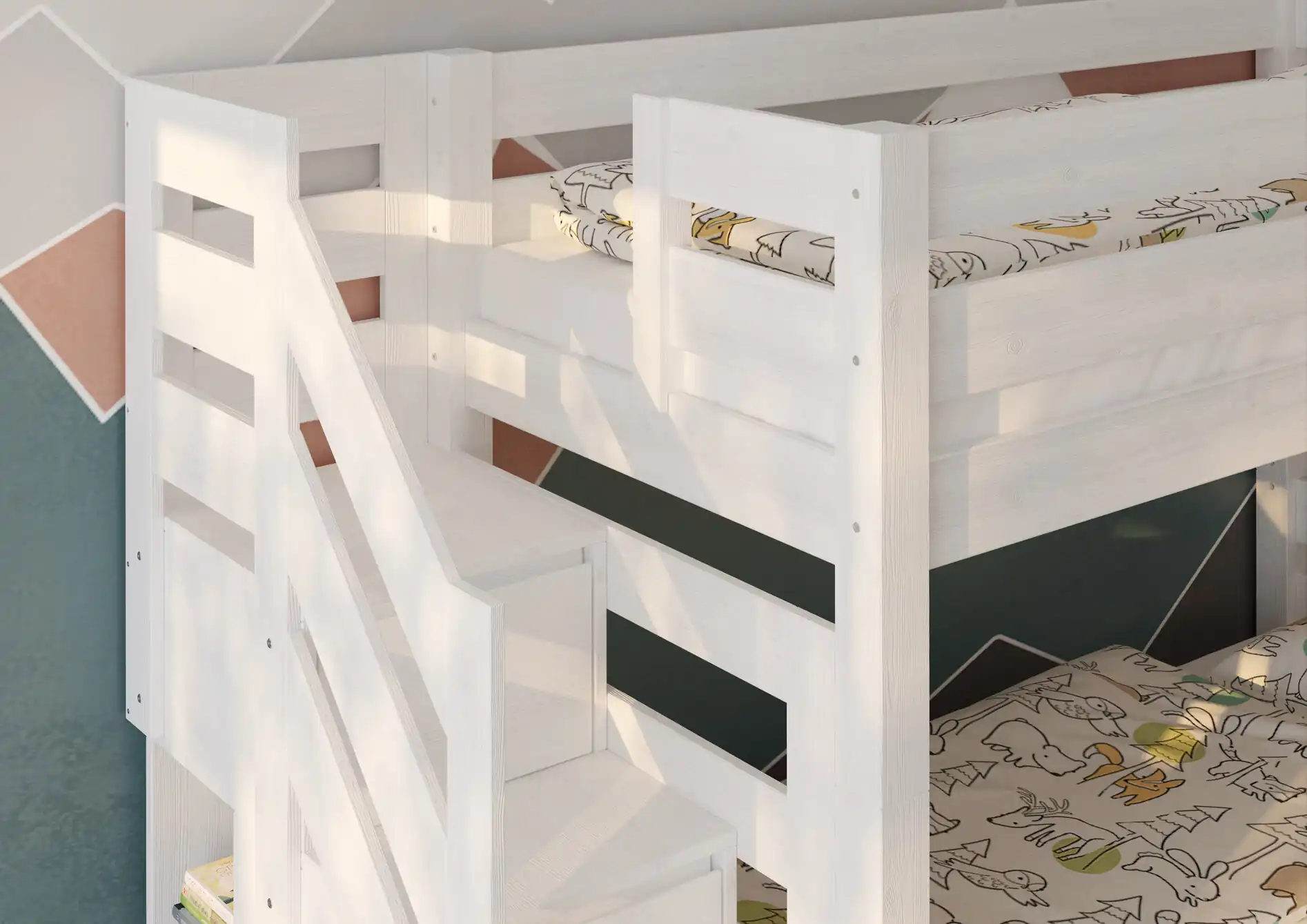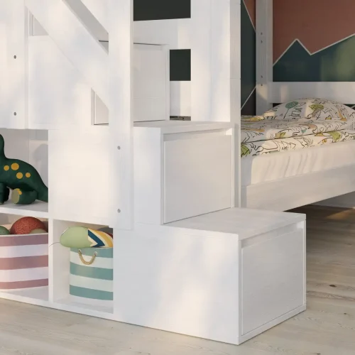Białe łóżko pięterko z drewna sosnowego to idealna propozycja dla rodziców, którzy chcą połączyć komfort snu, praktyczne przechowywanie i nowoczesny wygląd w jednym meblu. Dzięki stabilnym schodom z pojemnymi szufladami, łóżko staje się wielofunkcyjnym rozwiązaniem do pokoju dziecięcego.