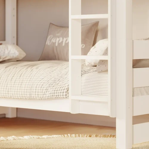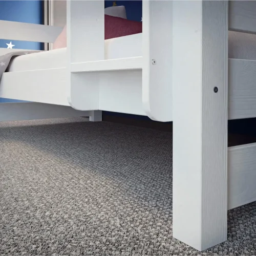 | Konstrukcja | Białe łóżko piętrowe Jan może zostać rozłożone na dwa osobne łóżka. Dokonuje się tego poprzez demontaż środkowych słupków podtrzymujących górną część. Do mocowania poszczególnych elementów wykorzystujemy śruby. Nie stosujemy elementów na kleju. |